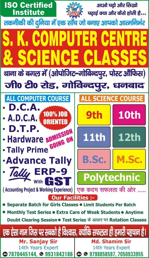SK Computer Center & Science Classes selflessly supports the student in making a successful career by guiding the student. Education is the necessary pace for the life of the students, after which all other places can be achieved in their life.